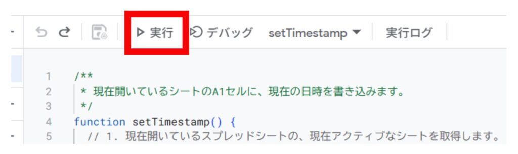 (※もし「実行する関数を選択」と表示されたら、setTimestamp を選んでください)