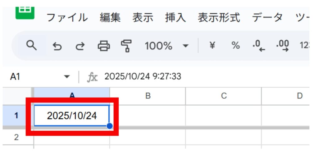 許可が完了し、GASが実行されると、スプレッドシートのA1セルに現在の日時が自動で入力されているはずです。
