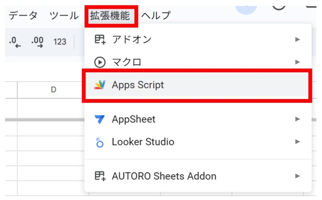 スプレッドシートのメニューバーから「拡張機能」 > 「Apps Script」をクリックします。
