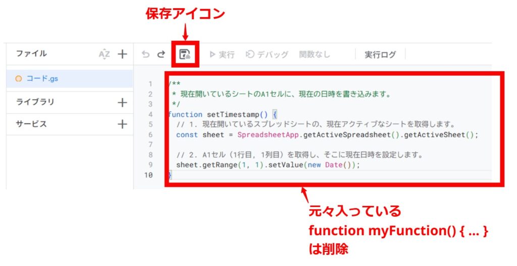 開いたエディタ画面に、最初からある function myFunction() { … } という記述をすべて消し、以下のコードをコピー&ペーストしてください。