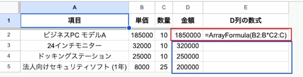 - D2セルに =ARRAYFORMULA(B2:B4*C2:C4) と入力する。