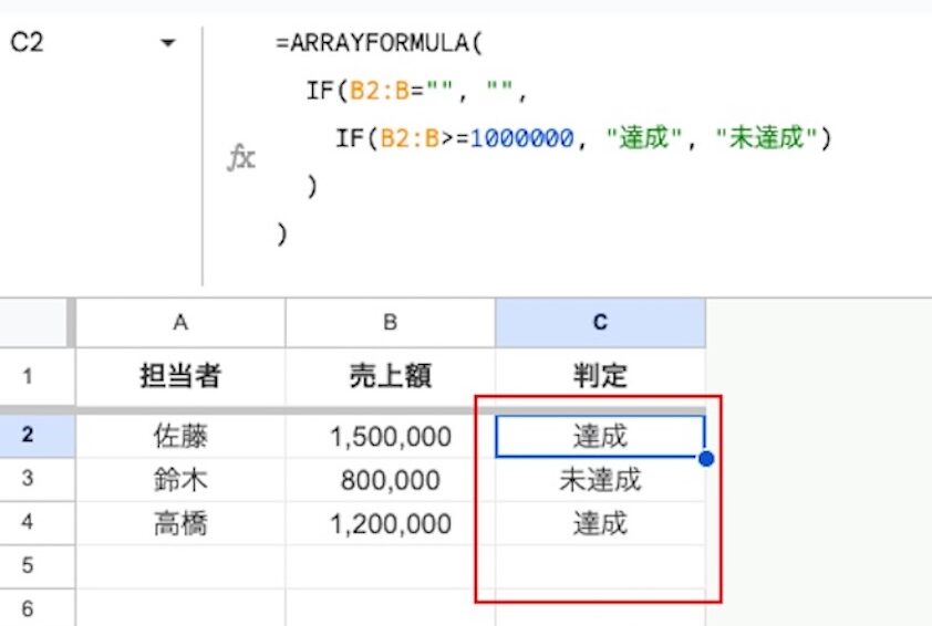 そうでなければ、内側のIF関数を実行する。 - この処理により、売上額が未入力の行(5行目以降)に「未達成」と表示されてしまうのを防ぎます。この方法はARRAYFORMULA関数とセットでよく使われるため、覚えておくと便利です。