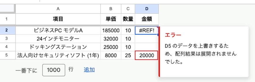 ARRAYFORMULA関数が結果を出力しようとする範囲に、手入力された文字や別の数式がすでに入っていると、#REF! というエラーが発生します。