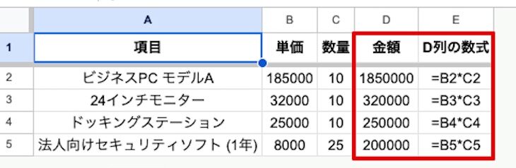 - D2セルに =B2*C2 と入力する。